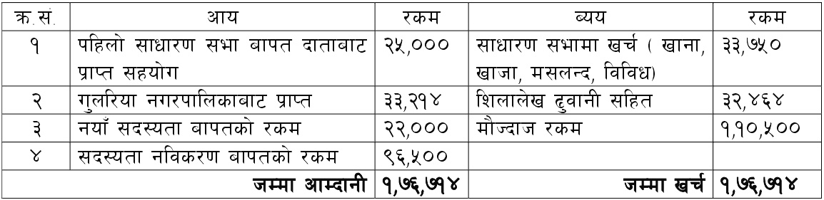 नेपाल पत्रकार महासंघ बर्दियाको २२ औं साधारणसभा तथा १२ औं अधिवेशनमा पेश गरिएको साढे १ बर्षको आय/ब्यय :