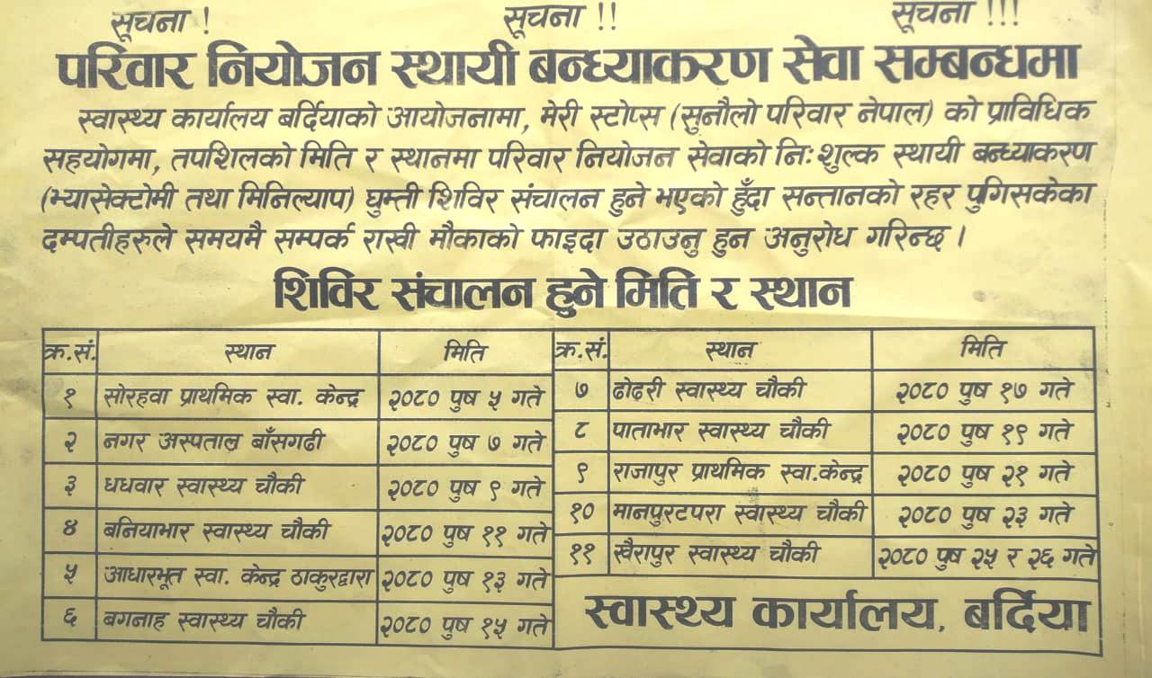 प्रमिला चौधरी, २६ पुष, गुलरिया (बर्दिया) । स्वास्थ्य कार्यालय बर्दियाको आयोजना तथा सुनौलो परिवार नेपाल (मेरी स्टोप्स) को प्राविधिक सहयोगामा बर्दियामा निःशुल्क स्थायी महिला तथा पुरुष बन्ध्याकरण शिविर हुँदैछ । बर्दियाका सबै पालिकामा हुन लागेको शिविर पुष महिनाभर संचालन रहनेछ ।